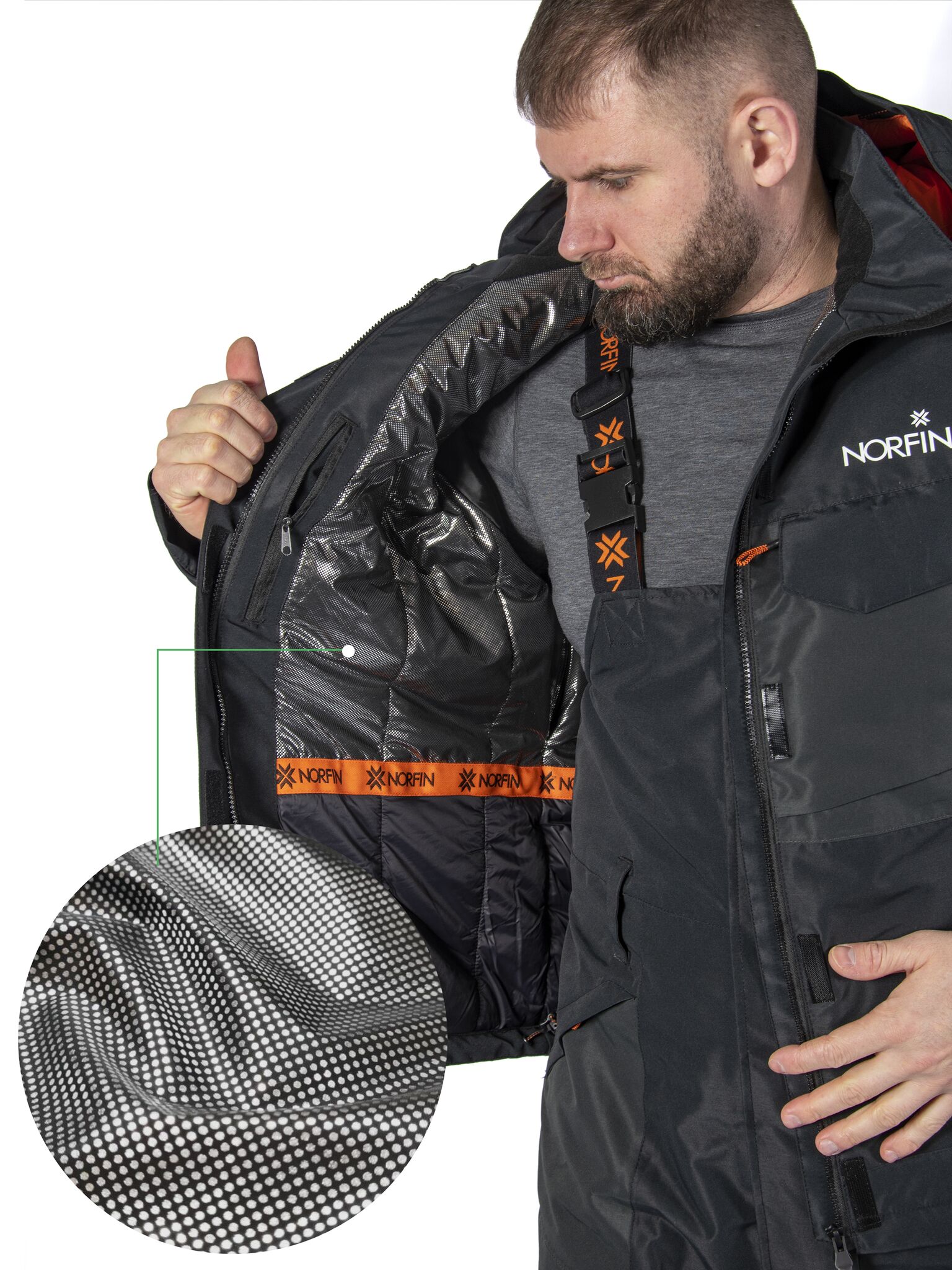 • Фольгированная подкладочная ткань с серебристыми точками, которая отражает тепло тела и сохраняет его внутри одежды, при этом позволяя выводить избыточную влагу наружу. Эта технология обеспечивает дополнительное тепло, сохраняя его на 20% эффективнее, чем обычная подкладка
